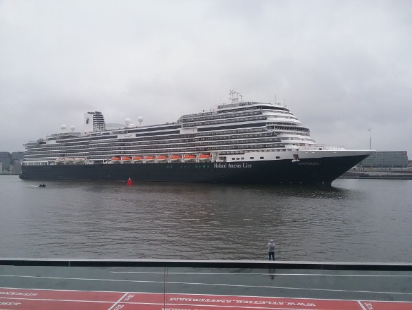 Koningsdam leaving Amsterdam as seen from the northern quay. It is her first departure from the Dutch capital, but sadly there were no spraying fireboats, very little greetings with other vessels and drizzling rain. The date is the 22nd of may, 2016.